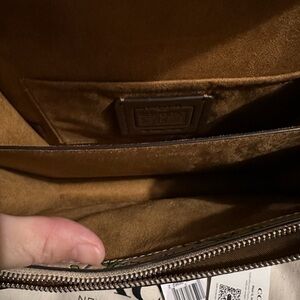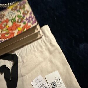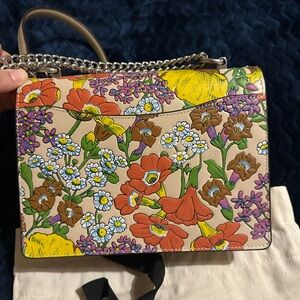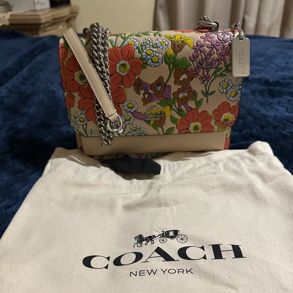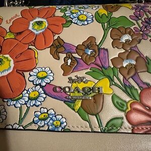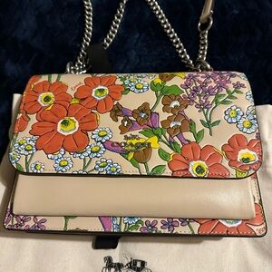 Chic Coach crossbody with vibrant floral design. Cream base with colorful flowers. Perfect for adding flair to any outfit.