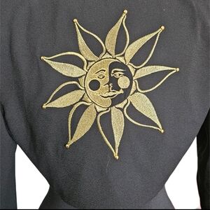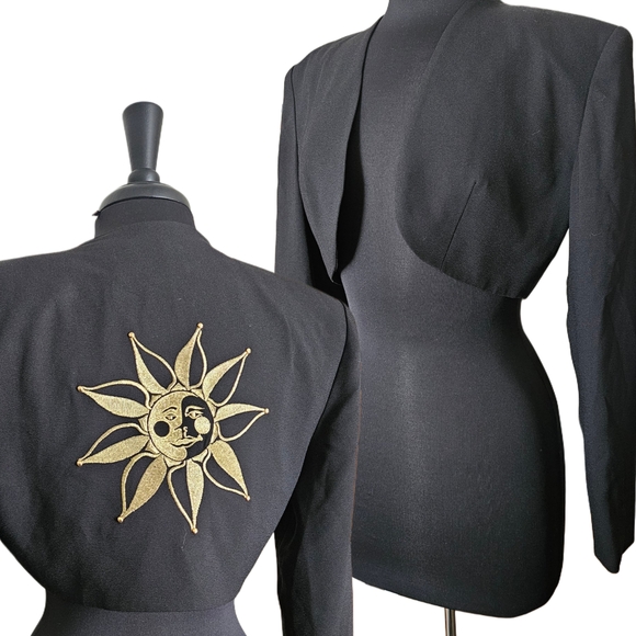 Cropped black blazer, with gold embroidered, celestial sun decal on back. Perfect for a whimsigoth look. Features shoulder pads for a structured shoulder.
