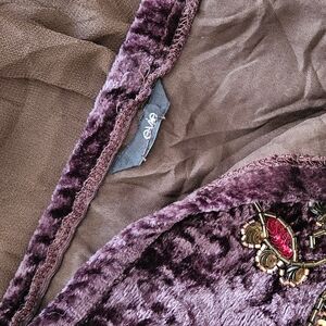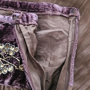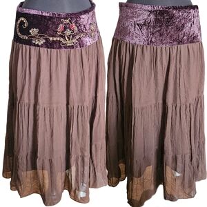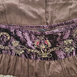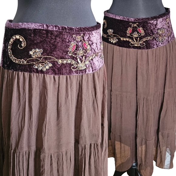 Beaded brown velvet waist and chiffon tiered skirt. This comes from a euro box I purchased earlier last year. Brand is Evie. There are some loose threads but beading is still in tact. Has a side zipper