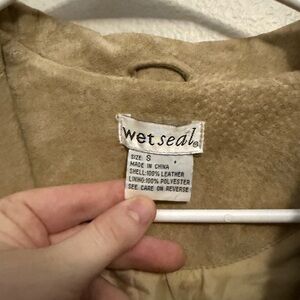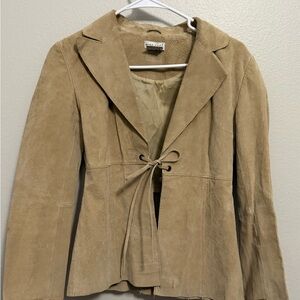 Stylish Wet Seal suede jacket in a neutral tan/beige tone. Features a flattering lace-up waist, notch lapel collar, and open front silhouette. Soft suede finish gives it a chic boho/western look.