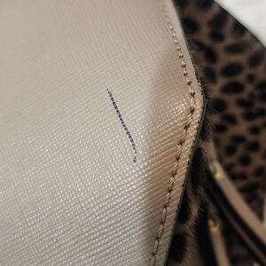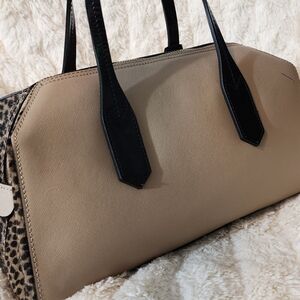 This chic women's satchel features a sleek tan body with elegant black handles. Ideal for any occasion, it offers both style and practicality.Innue Animal Hair Printed Leather Handbag, Black and Beige