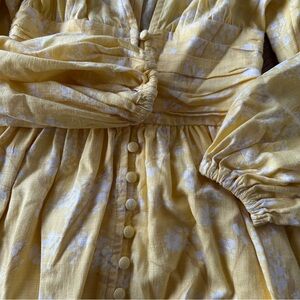 This chic, boho-style garment features a plunging V-neckline, long puff sleeves, a defined waist, button closures, and a flouncy skirt.