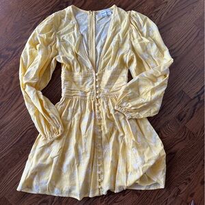 Chic yellow dress with floral pattern. Features long sleeves and deep V-neck. Ideal for stylish outings.