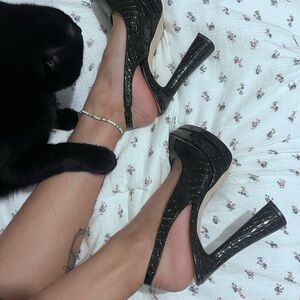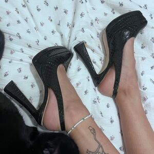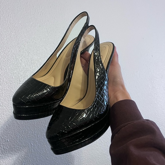 Jessica Simpson Mayria slingback platform pumps in black patent faux leather with a crocodile/snake embossed texture.