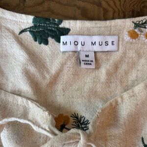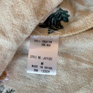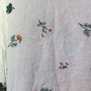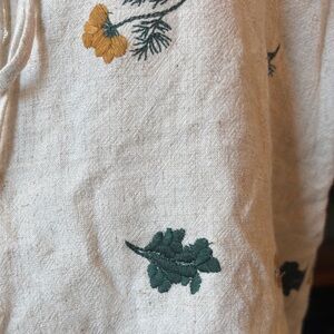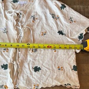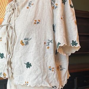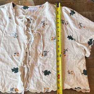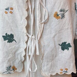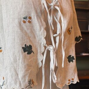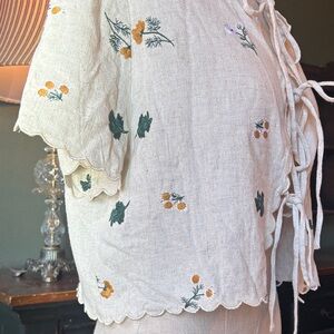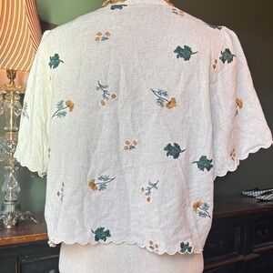 Adorable & feminine floral embroidered cream colored, tie front shirt, with scalloped hem & sleeves. Perfect, Vintage and nature inspired cotton / linen blend. Size medium