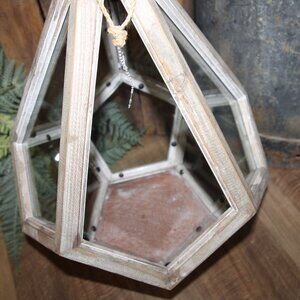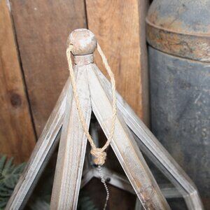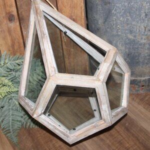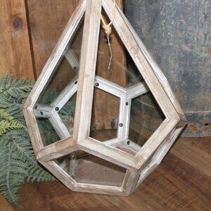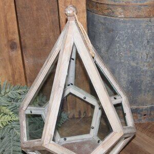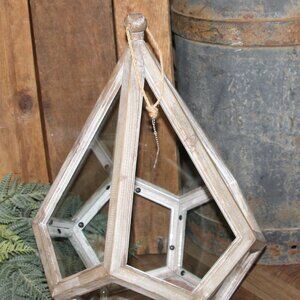 NEW! Large 18.5" tall x 12" wide x 12" deep natural reclaimed wood and glass lantern. Unique shape with hanging rope at top finial and one top section open (no glass) for interior access. Great piece for rustic, French Country or farmhouse decor!