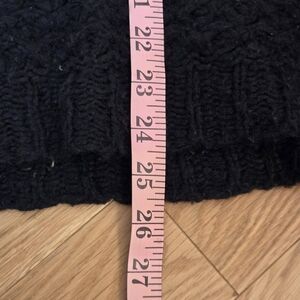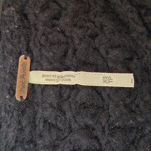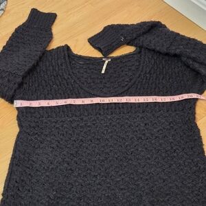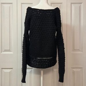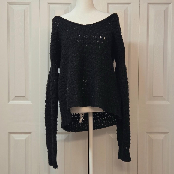 Free People winter boho sweater featuring textured black open knit, acrylic and wool blend, long sleeves with ruched upper arm, slouchy and oversized fit.