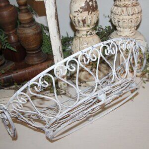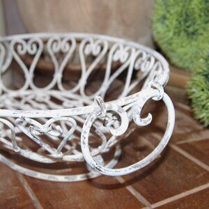 Vintage 15" wide x 4.25" tall x 10.25" deep wrought iron oval basket with scrolled designs, swing handles at sides and awesome chippy and distressed, weathered and aged white and gray patina. Fill with seasonal goodies for year round use! Great piece for Shabby Chic, French Country or farmhouse cottage decor!