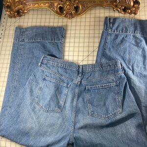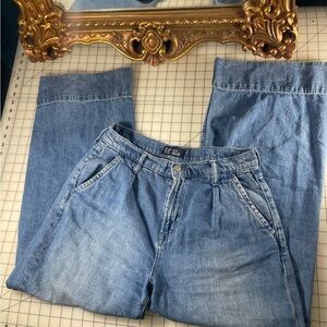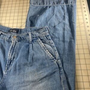 Classic pleated high rise jeans. Wide-leg style. Has a wide lower cuff which makes the drape very classy. Perfect for casual wear.