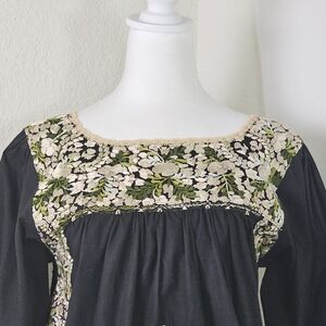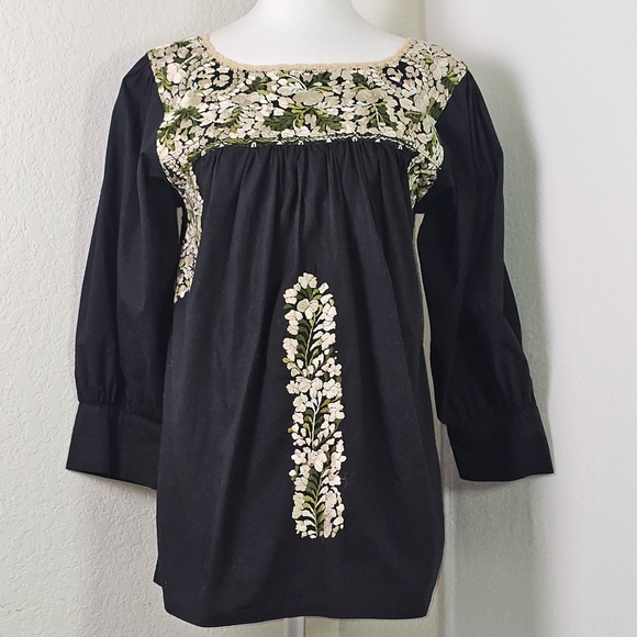 Boho blouse, Mexican embroidery, artisan top, Mi Golondrina, floral tunic, festival fashion, folk style, black embroidered shirt, cottagecore, resort wear, handcrafted, vintage-inspired, peasant blouse, puff sleeve, ethical fashion