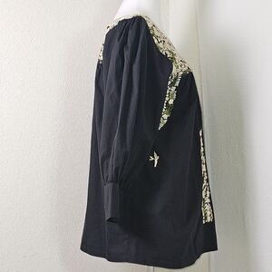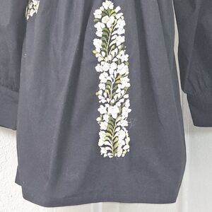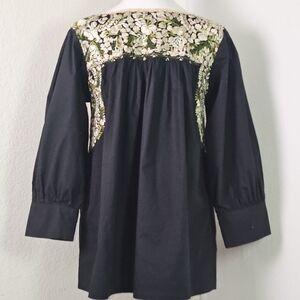 Elevate your wardrobe with this stunning Mi Golondrina tunic blouse, handcrafted in Mexico with intricate floral embroidery in cream and olive green hues. This artisan top features long sleeves with wide cuffs, a square neckline, and signature bird embroidery on the side. Made from soft black cotton, it offers a relaxed, flowing fit with beautiful drape and exceptional craftsmanship.