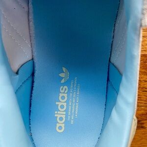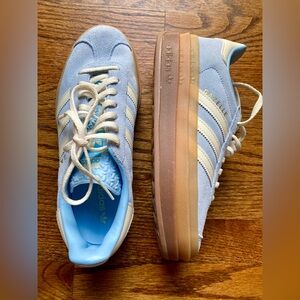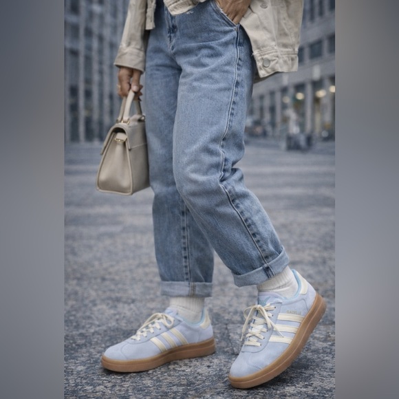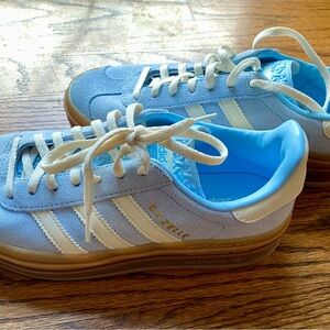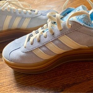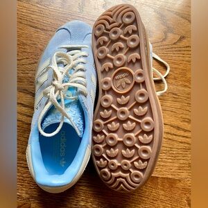 Classic Adidas Gazelle sneakers in a light blue suede with cream three-stripe detailing and a gum rubber sole.
