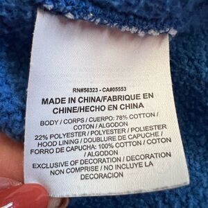 Full zipper closure, two hand pockets. Hoodie with drawstring for adjustment. Good condition. Has one faded spot on the right sleeve.