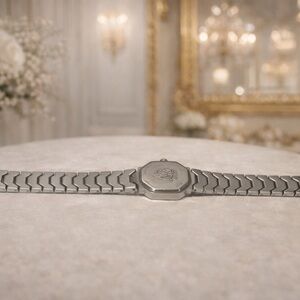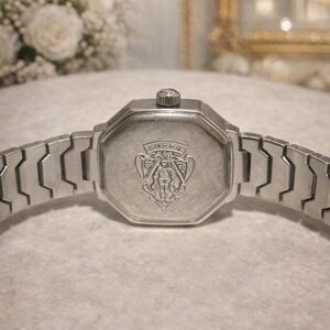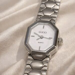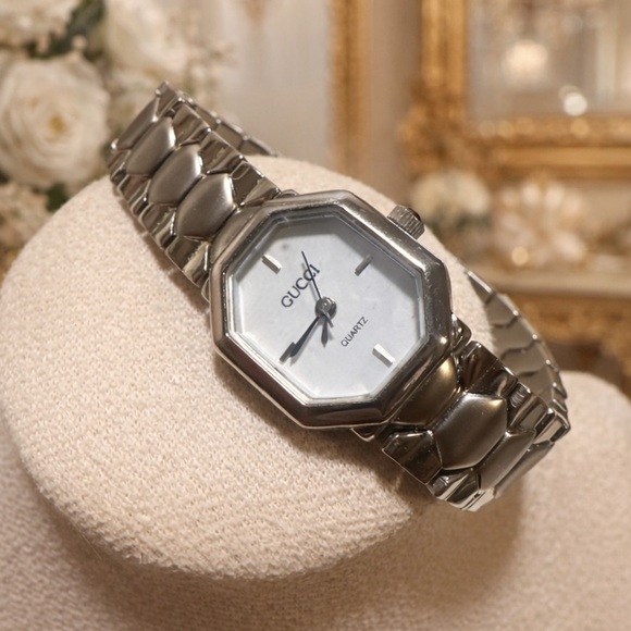 Beautiful vintage Gucci quartz wristwatch featuring a sleek octagonal case and classic silver tone bracelet. This piece is in working condition and presents extremely well. Timeless minimalist design makes it perfect for everyday wear or luxury collection display.
