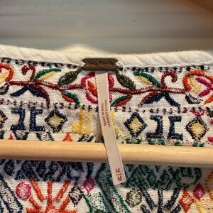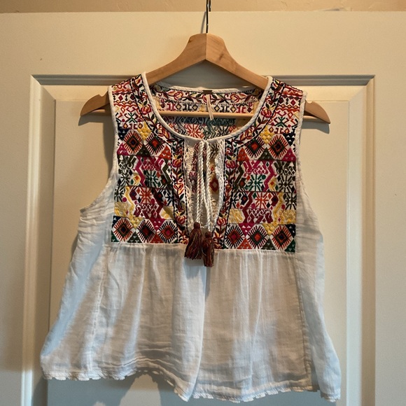 Vibrant embroidery on a white sleeveless blouse. Perfect for casual wear.