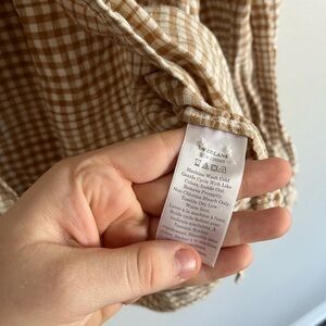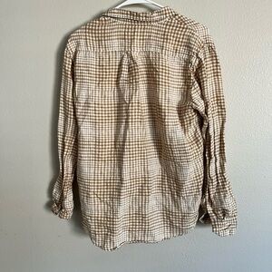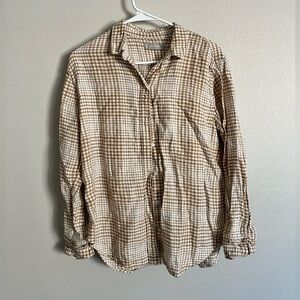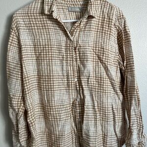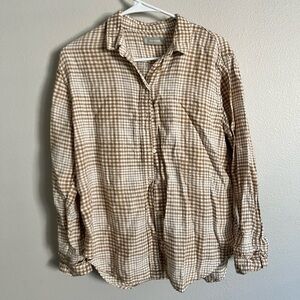 Chic plaid design in iced coffee tones. Lightweight linen fabric. Perfect for casual elegance.