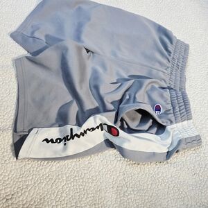 Style: Athletic basketball shorts with colorblock side panels and a vertical "Champion" script logo on the left leg.
