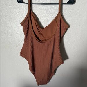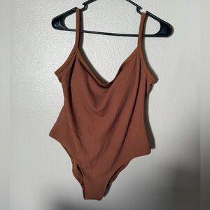 Textured ribbed swimsuit with classic silhouette. Features a scoop back design. Sleek and minimalist style perfect for poolside or beach wear.