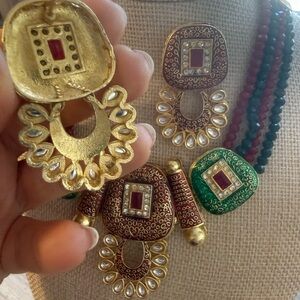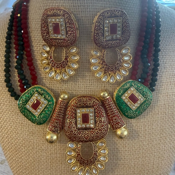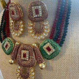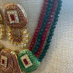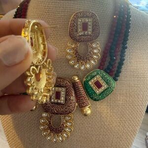 This exquisite jewelry set features a stunning combination of gold and green, perfect for adding a touch of elegance to any outfit. The intricate design and vibrant colors make it a standout piece for any occasion.