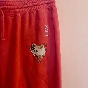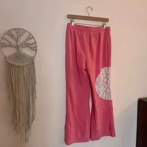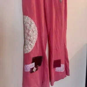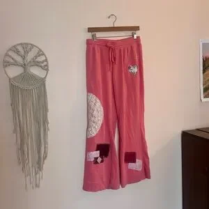 Brand new. Upcycled boho sweatpants. Mid rise. Adjustable waist. Doily and patchwork added. Waist is 15in.