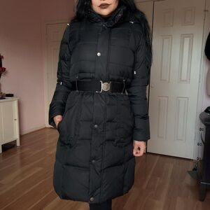 Black puffer long coat by DKNY • Faux fur around hood • Zipper with 7 snap buttons down front • A pocket on each side • Comes with belt to accentuate waist