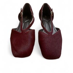 NWOT Burgundy red furskin leather ballet flats. Double strap with adjustable buckle at ankle. Squared toe. From ZARA, in US size 8 (EUR 39).
