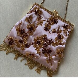 # silky beaded crossbody purse— with kiss lock closure, gold hardware detail, floral beading + beaded fringe
