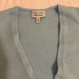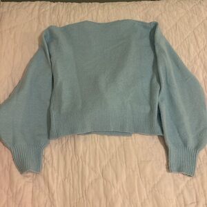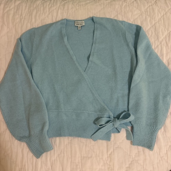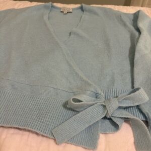 Chic wrap cardigan in sky blue. Features a stylish tie detail. Ideal for layering. Has minor pilling throughout.