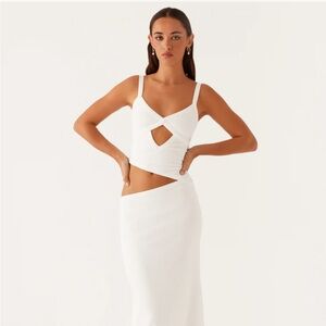 Stunning Peppermayo white maxi dress featuring a modern cut-out design and sleek, fitted silhouette. This sleeveless style offers a flattering shape with subtle statement detailing, making it perfect for vacations, bridal events, bachelorette weekends, summer parties, or elevated nights out.