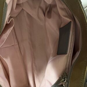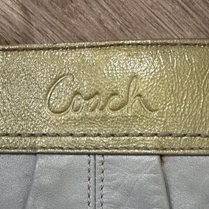 Sophisticated Coach shoulder bag in gray and olive. Features dual straps and buckle accents. Ideal for daily elegance.