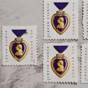 4 2014 Purple Heart Medal Forever stamps . They are part of a series of stamps honoring the Purple Heart, the oldest military decoration in use, which was originally established by George Washington in 1782. The 2014 stamps feature a photograph by Ira Wexler of a Purple Heart medal awarded during World War II. These stamps have a nominal value of 49 cents at the time of issue, but as "Forever" stamps, they are always equal to the current First-Class Mail one-ounce rate. They were issued on October 11, 2014, in Dover, Delaware