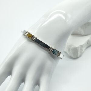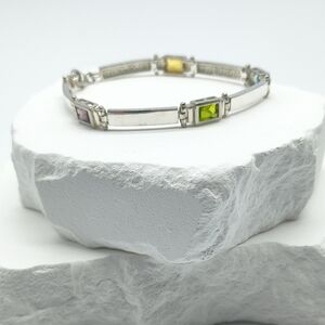 Rectangular Sterling Bar Links are separated by faceted gemstones featuring Citrine, Topaz, Peridot and Amethyst