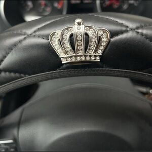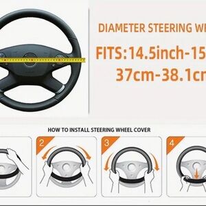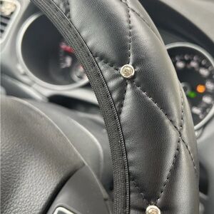 Excellent condition stretchy steering wheel cover. Easy installation, water resistant, anti slip. Fits wheels with diameters of 14.5-15 inches. Made of PU leather. No flaws.