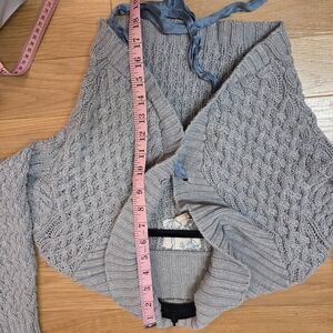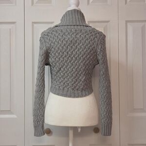 Features: light gray knit fabric, shawl collar / roll over collar, long sleeves, ribbed trims, front bow tie closure, and cropped fit