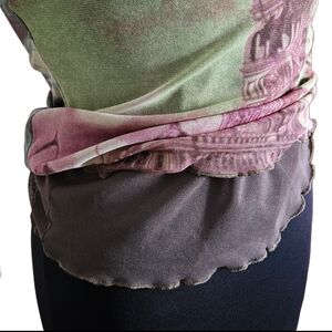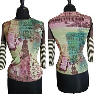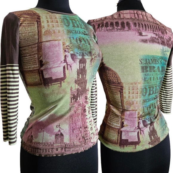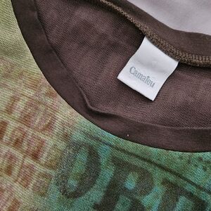 Unique Camaîeu mesh top. Features 3/4 Sleeves and double mesh for coverage. Sleeves are not mesh, and instead a jersey material. I love this blouse but it's too tight for my liking. Best for a small or a smaller sized medium. Selling at what I paid for it.