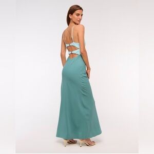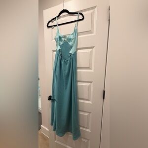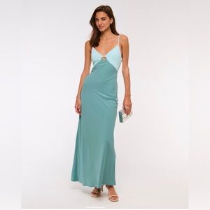 Elegant Abercrombie & Fitch maxi dress featuring a sleek colorblock design in soft blue and seafoam tones. Designed with delicate spaghetti straps, a flattering V-neckline with subtle front cutout, and a smooth, body-skimming silhouette that flows beautifully to the hem.
