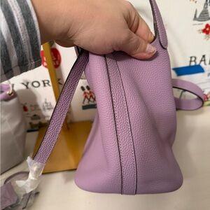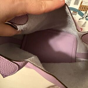 Chic and stylish lavender leather tote bag perfect for any occasion. Add a pop of color to your outfit with this elegant accessory.