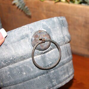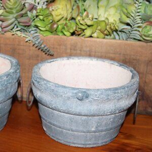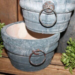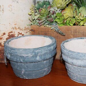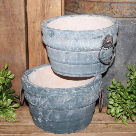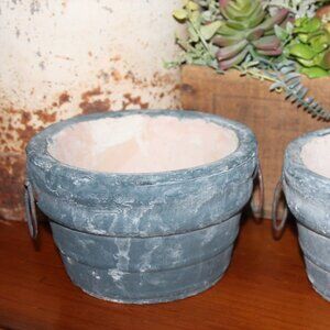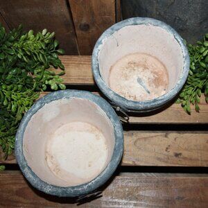 Pair of 4.5" tall x 7" pottery stone planter pots. Gorgeous distressed and aged blue patina and O-Ring handles on each. Very Shabby, weathered finish! No chips or cracks on either. ⭐️ This pair has NOT BEEN USED, interior stains from original production.⭐️ SET SOLD AS IS! ⭐️ Gorgeous pieces for Old World, French Country or farmhouse cottage decor!