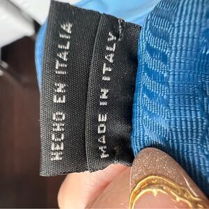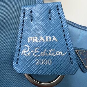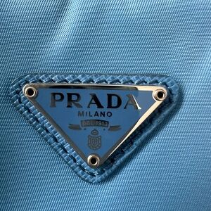 Chic Prada shoulder bag in sky blue. Sleek design with iconic logo. Ideal for stylish outings.