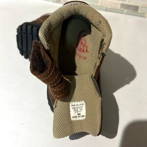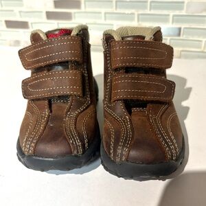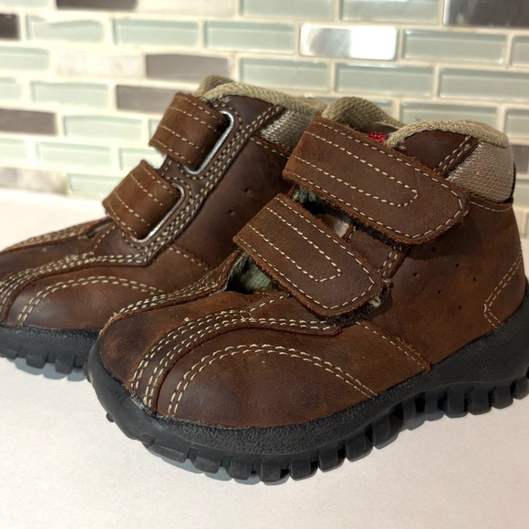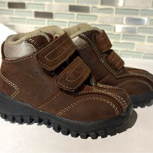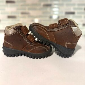 Stylish and durable brown kids shoes featuring easy-to-use Velcro straps. Perfect for everyday adventures.