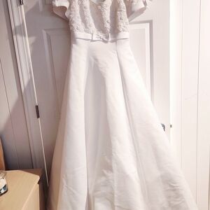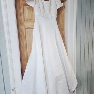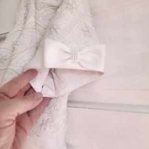 Charming, pale cream, full length, wedding dress with intricate beaded and embroidered bodice. Features a bow at the waist. A bow on each sleeve with a big bow on the back! Perfect for your special day! Size 14