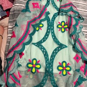Vibrant teal dress with pink and yellow floral accents. Perfect for casual outings. Comfortable and stylish.
