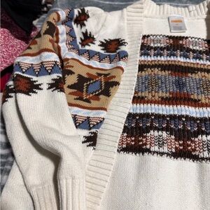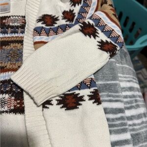 Cozy cream sweater with brown and blue patterns. Open front design. Perfect for layering.