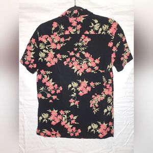 Casual button-down shirt with pink floral print. Ideal for relaxed settings.