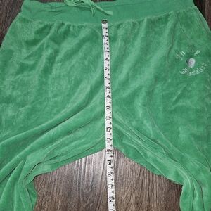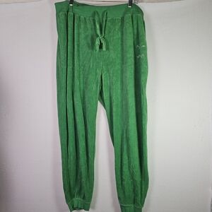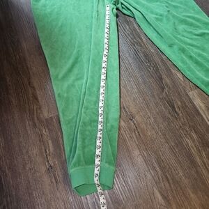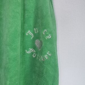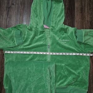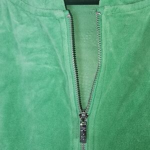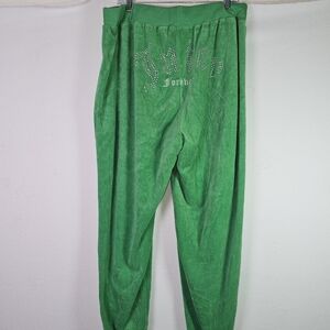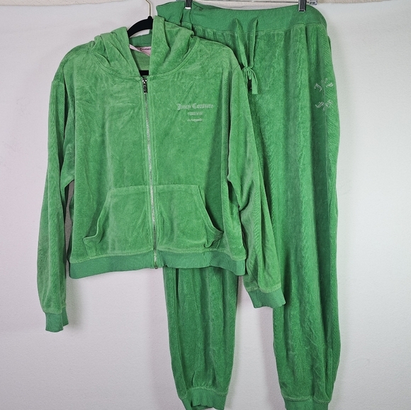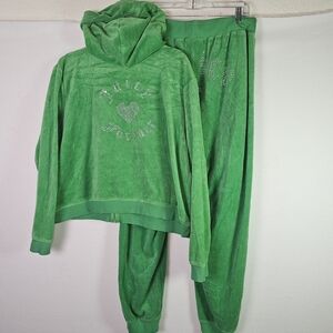 The Juicy Couture Forever 21 Green Velour Women's Tracksuit Y2K in size 3X is a stylish and comfortable two-piece set perfect for activewear. Made from polyester velour fabric, this solid green tracksuit includes a hooded sweatshirt and matching pants with a zip closure. The Y2K and athleisure theme adds a trendy touch to this plus-size outfit, ideal for winter and fall seasons. Featuring an elastic waist, hood, and pockets, this tracksuit offers both style and functionality for walking or any other activities.