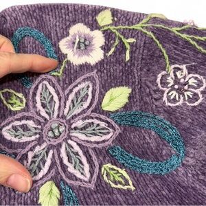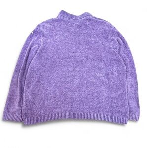 Cozy vintage Alfred Dunner sweater featuring a soft chenille-style texture and delicate floral embroidery detail. Beautiful purple color with a relaxed, comfortable fit.