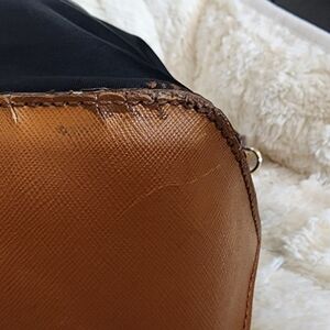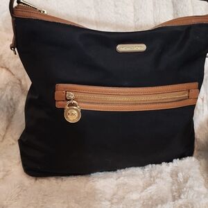 Chic Michael Kors shoulder bag. Black body with brown accents. Gold-tone hardware adds elegance.