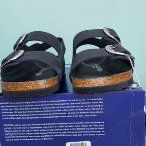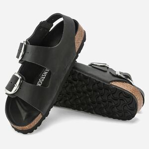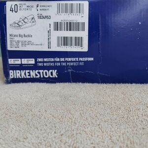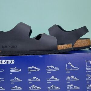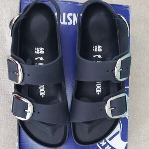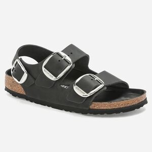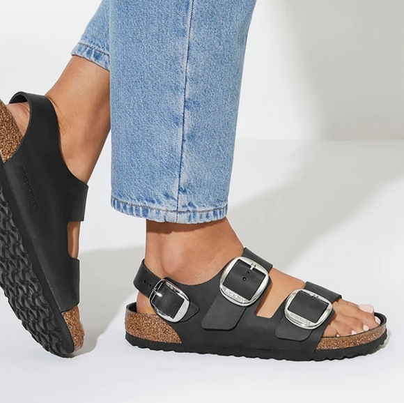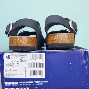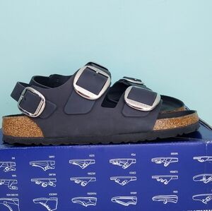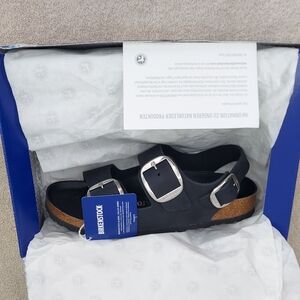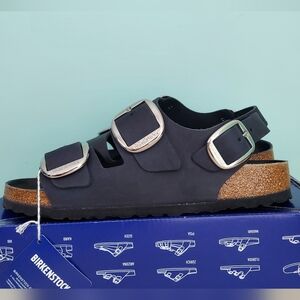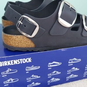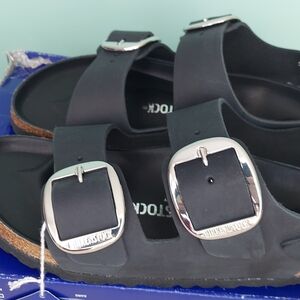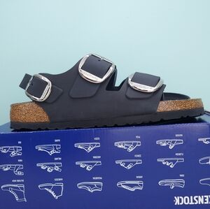 Birkenstock Milano Big Buckle sandals in Black with silver big buckles. Women's size 9 Narrow fit, EU 40, or men's size 7 Narrow Fit. Birkenstock Milano Big Buckle sandals are a lightweight, neutral, and versatile classic with elevated hardware. (Light scratch on strap. Only noticeable upon inspection. See photos) Made with a genuine natural leather upper featuring a smooth, structured finish and oversized metal buckles for a polished look. Designed with Birkenstock’s signature cork-latex contoured footbed for arch support and comfort, plus a lightweight EVA outsole for shock absorption. Great for anyone with medical problems with their feet and back. The Milano backstrap provides added stability while maintaining a clean, wearable silhouette ideal for streetwear, office wear, vacation, resort wear, travel, and everyday casual outfits. Spring, summer, and fall essentials. Brand new with tags, never worn, and ships in the original Birk box. Any defects IF any are shown in photos. Smoke-free and pet-free home.