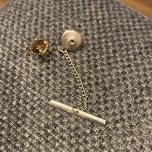 Elegant silver amber tie clip with a gold accent. Features a unique chain design.