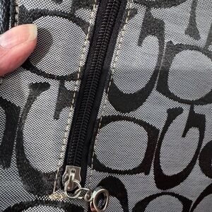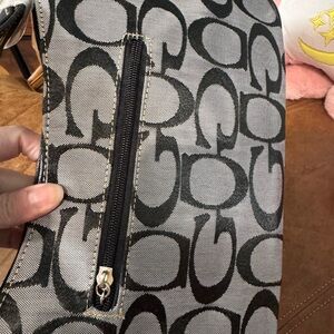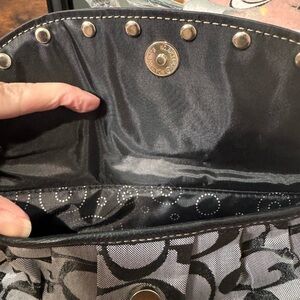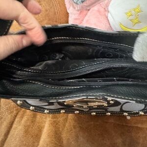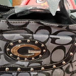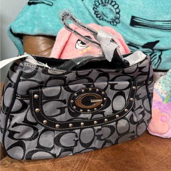 Elegant shoulder bag with iconic logo pattern. Features studded detailing and a sleek design.